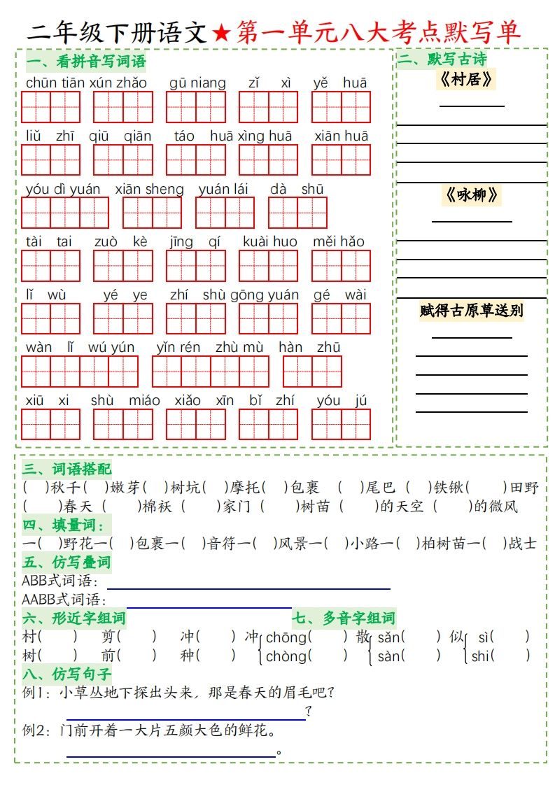 二年级下册语文八大考点默写单空白