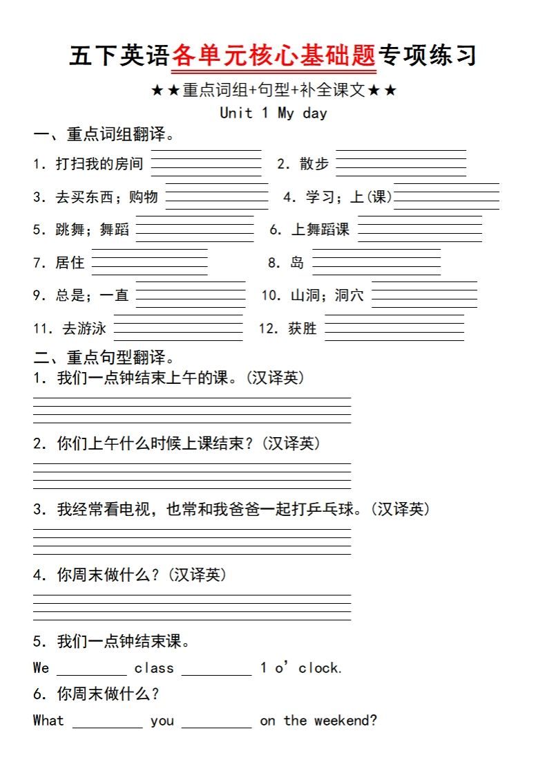 当前位置:首页学科年级五年级五下英语人教PEP各单元核心基础题专项练习(unit1)