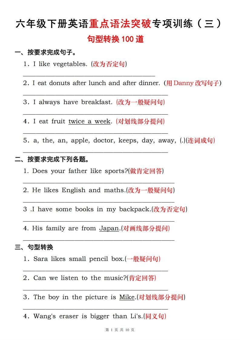 六下人教pep英语英语重点语法突破专项训练(三)句型转换转换