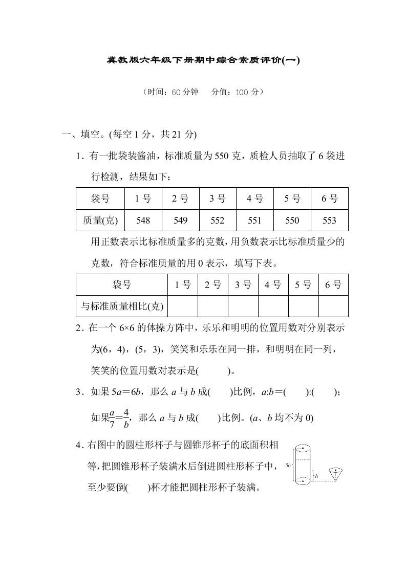 冀教版六年级数学下册期中综合素质评价(一)含答案
