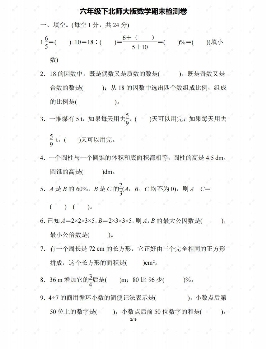 北师大六年级数学下册期末检测⑤卷及答案