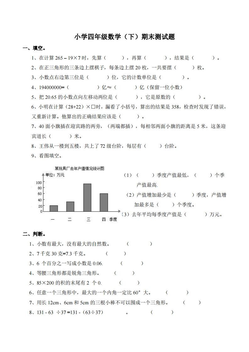 四下西师版数学期末测试卷-1