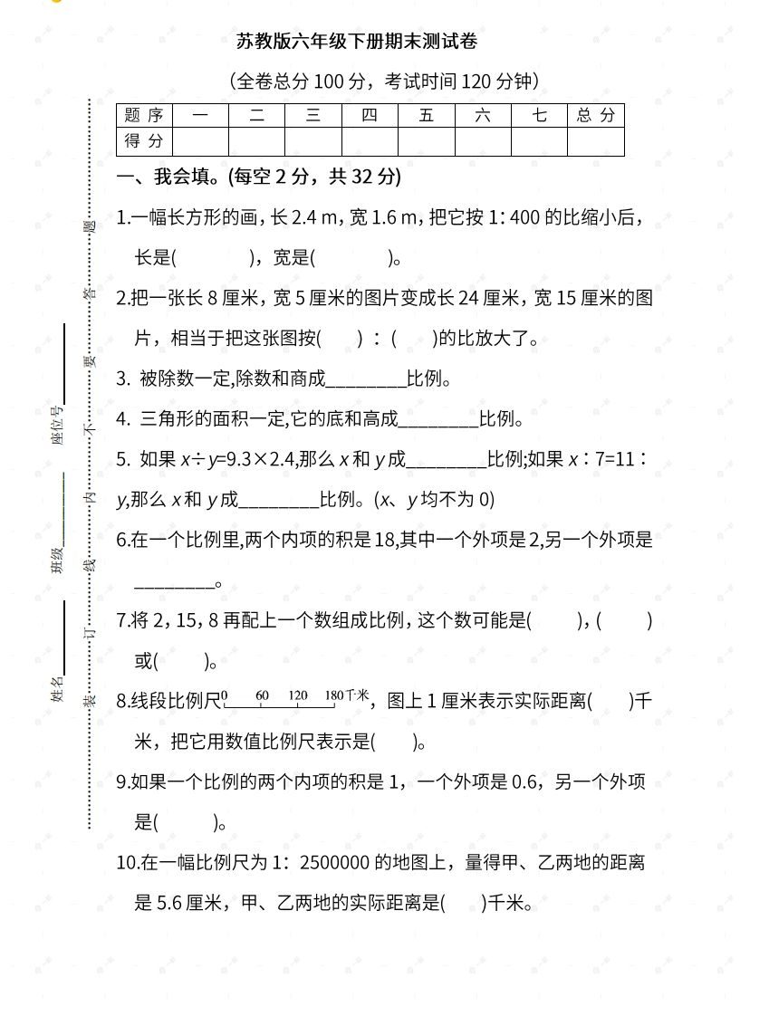 当前位置:首页学科年级六年级苏教六年级数学下册期末测试④卷及答案
