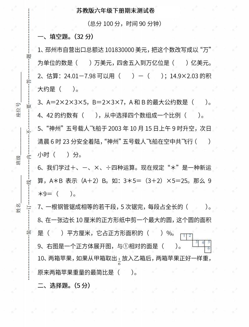 当前位置:首页学科年级六年级苏教六年级数学下册期末测试⑤卷及答案