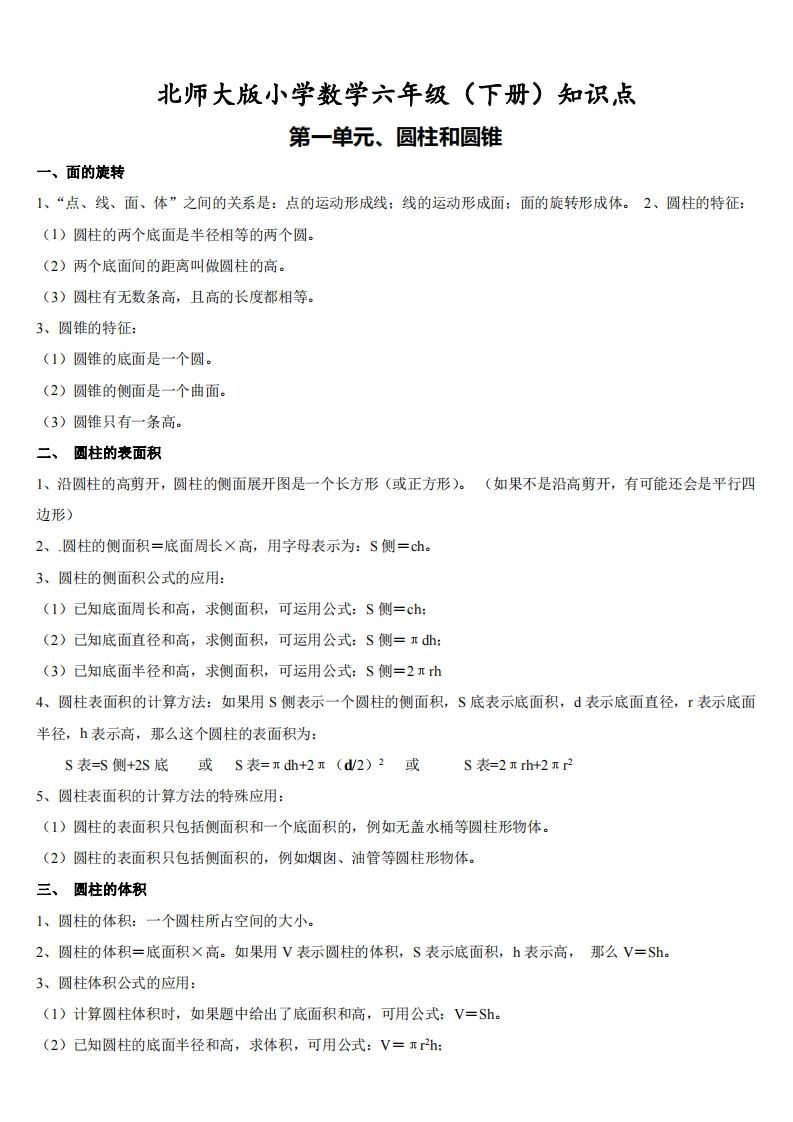 六下北师大数学期末总复习公式大全