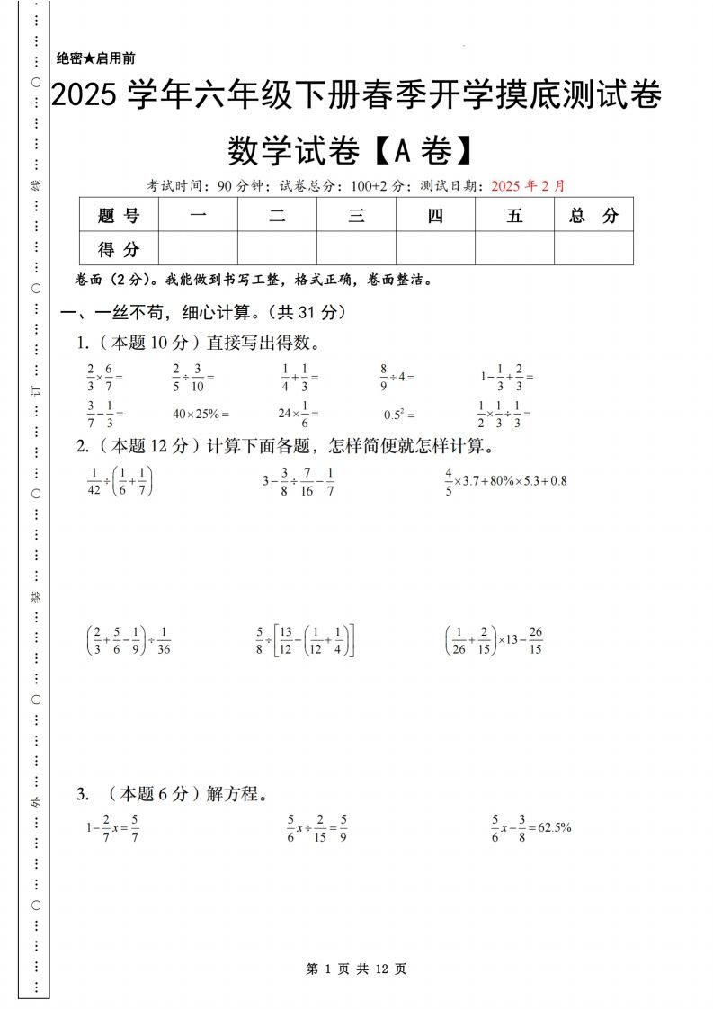 当前位置:首页学科年级六年级【苏教】2025学年六年级下册春季开学摸底测试卷数学试卷【A卷】