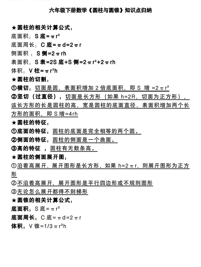 六下数学《圆柱与圆锥》知识点归纳