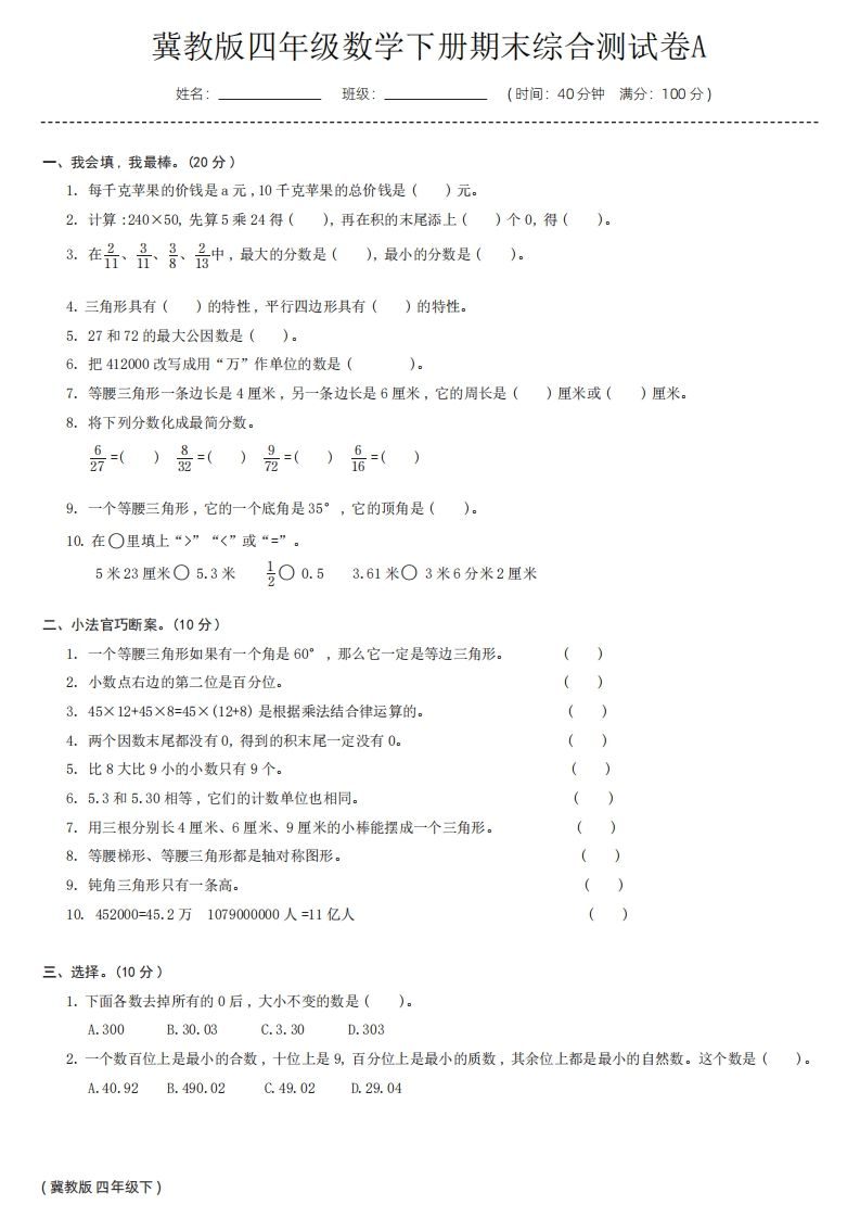 当前位置:首页学科年级四年级【冀教版】四年级数学下册期末综合测试卷a