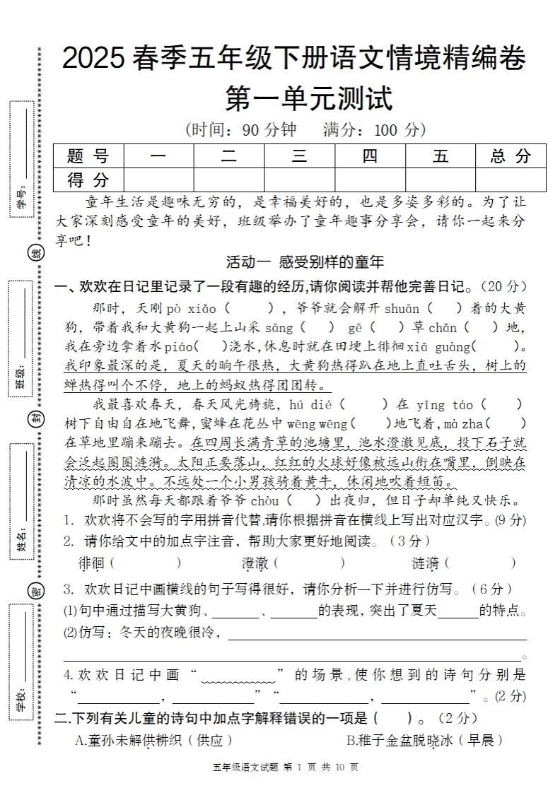 当前位置:首页学科年级五年级2025春季五年级下册语文第一单元情境精编卷