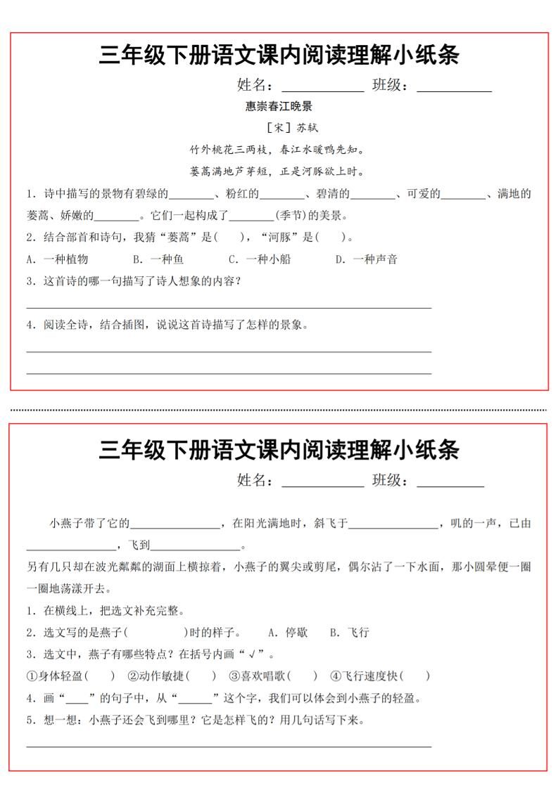 三年级下册语文课内阅读理解小纸条13页