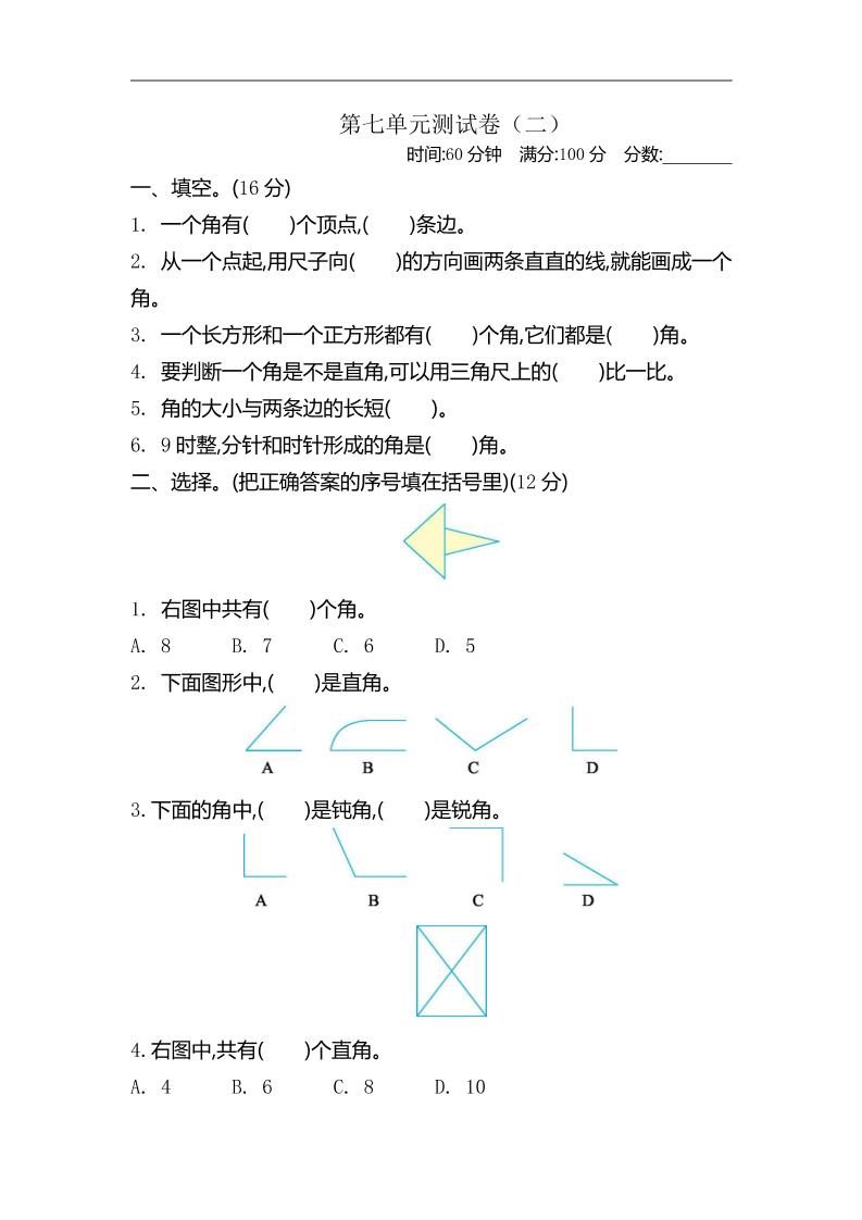 当前位置:首页学科年级二年级二下苏教版数学第七单元测试卷-2