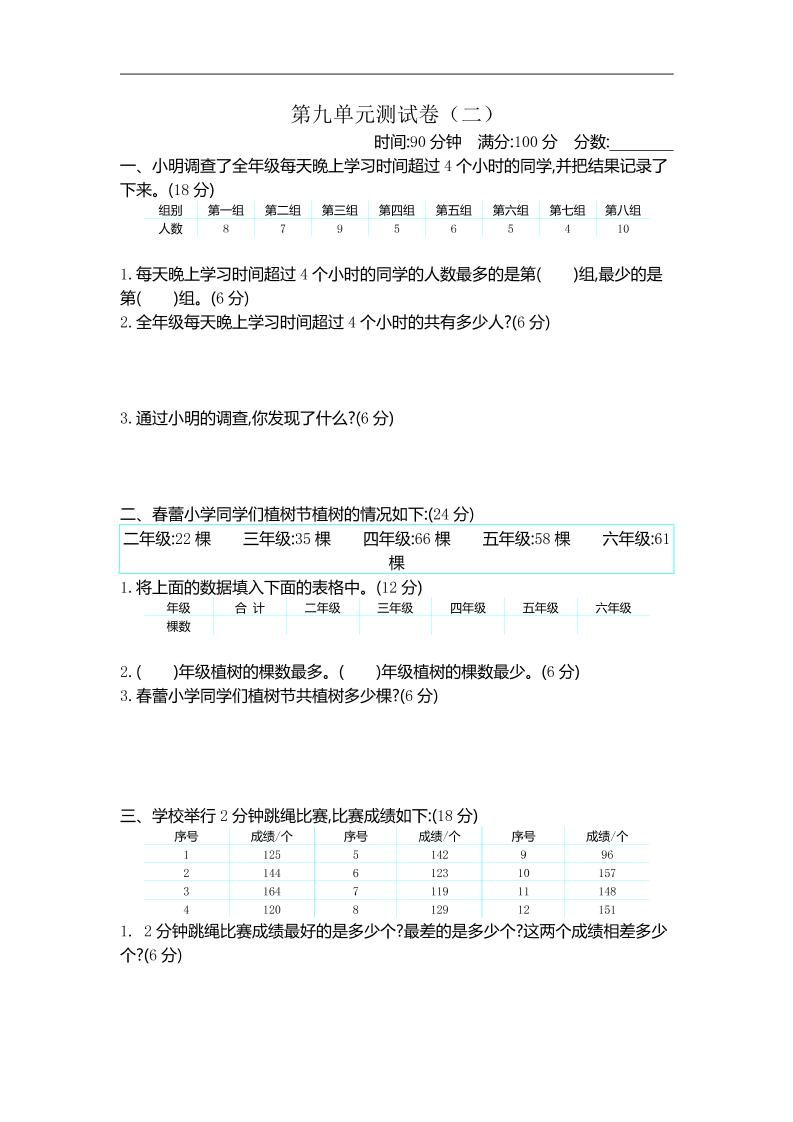 三下苏教版数学第九单元检测卷-2