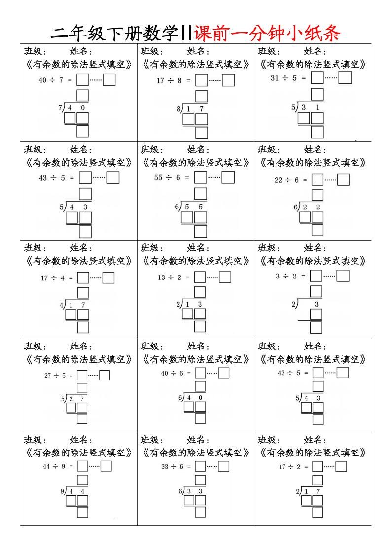 二下数学课内计算拔尖练习小纸条(15页30条)-高清无水印完整版本