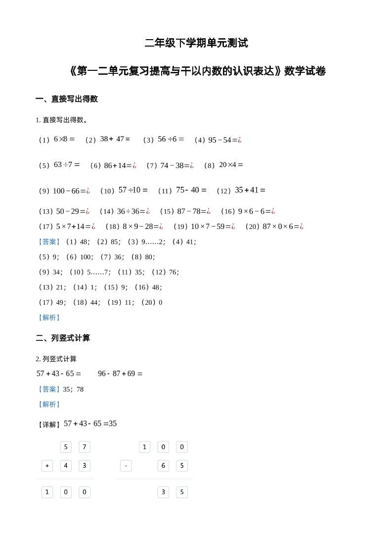 当前位置:首页学科年级二年级沪教版数学二年级下册第一、二单元单元测试卷(解析版)