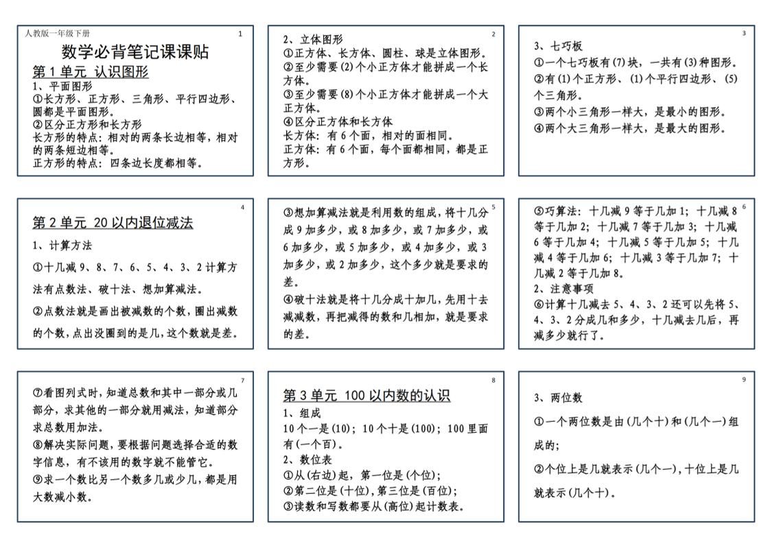 当前位置:首页学科年级一年级25新一下数学必背笔记课课贴(2版)