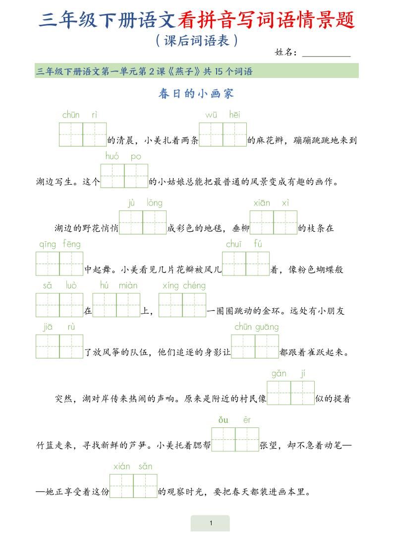25春三下语文词语表看拼音写词语情景题(34页)
