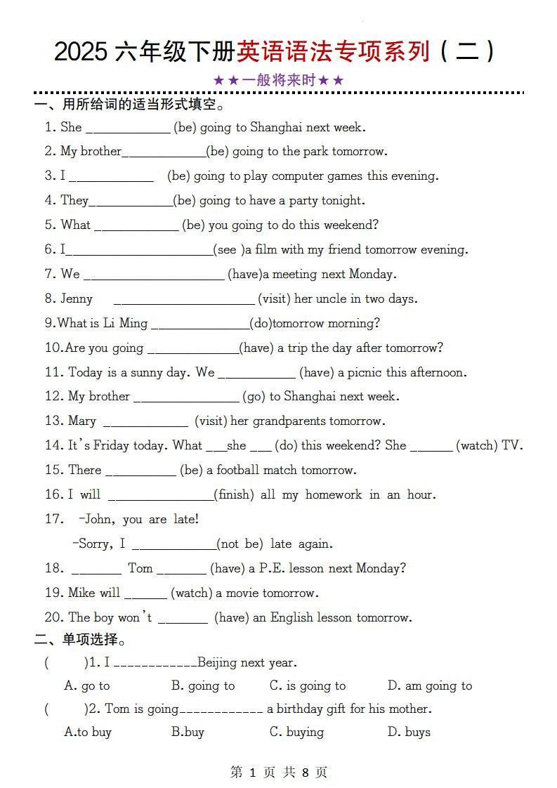 当前位置:首页学科年级六年级【2-24】【英语】2025六年级下册英语语法专项系列(二)★★一般将来时★★