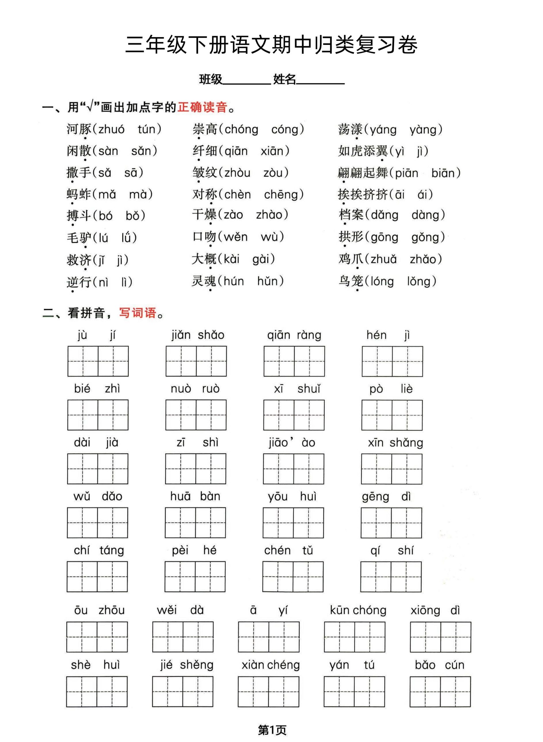 三年级下册语文期中归类整合复习卷,考查内容1-4单元