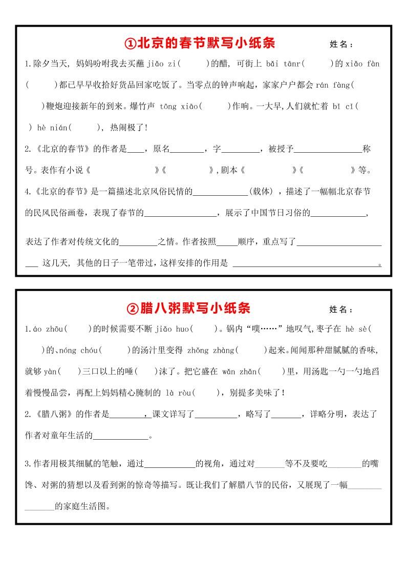 六下语文全册默写每日一练小纸条【空白】