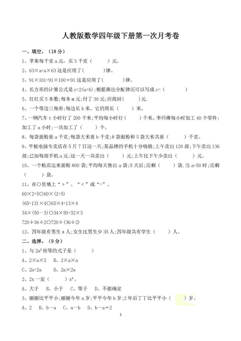 四年级下册数学人教版第一次阶段性月考测试含答案