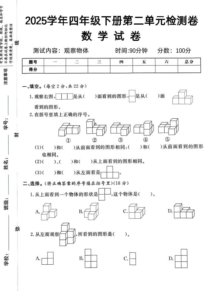 当前位置:首页学科年级四年级2025四下《数学第二单元检测卷二》人教版