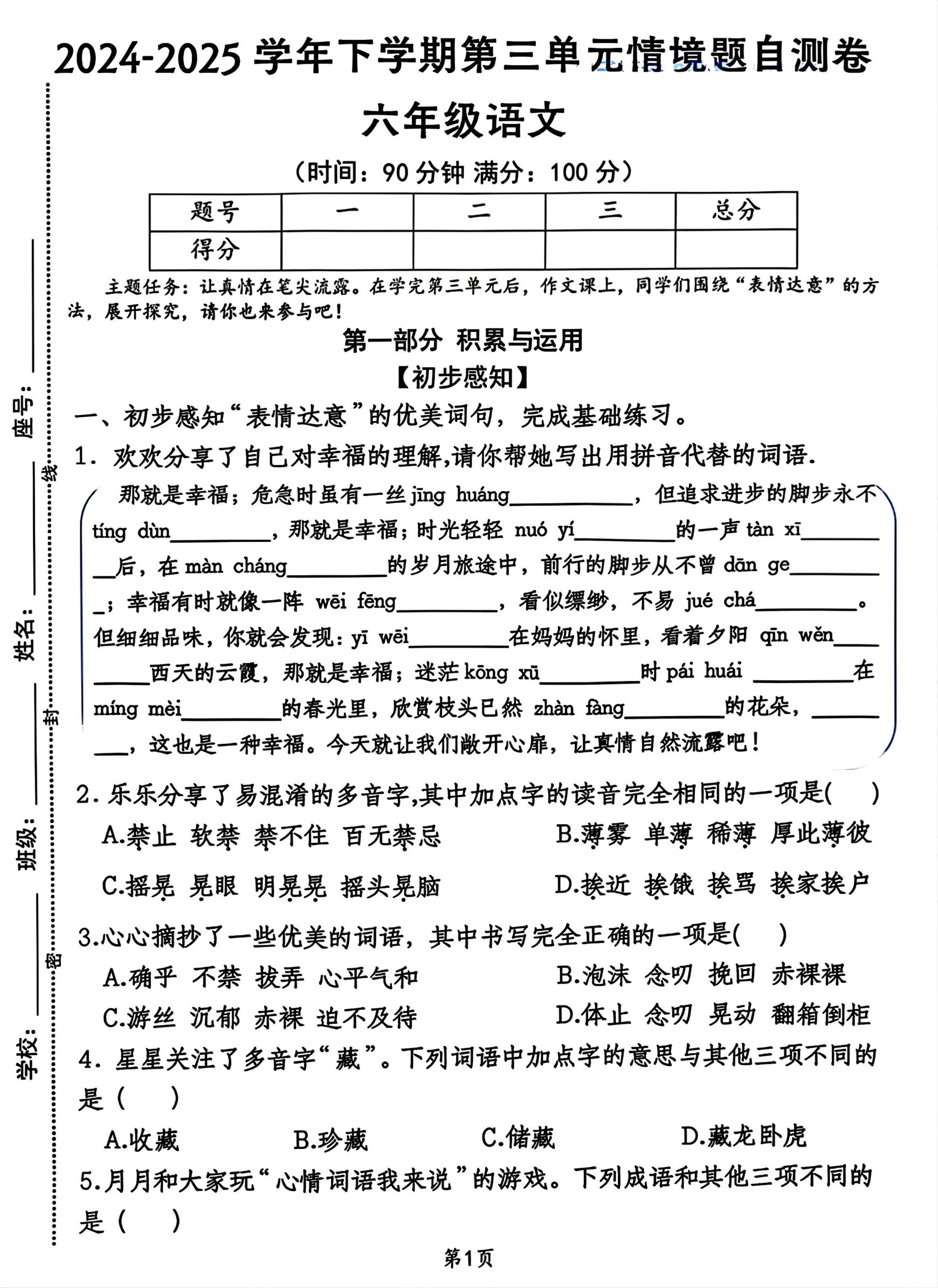 当前位置:首页学科年级六年级2025六年级下册语文第三单元情景自测题7页