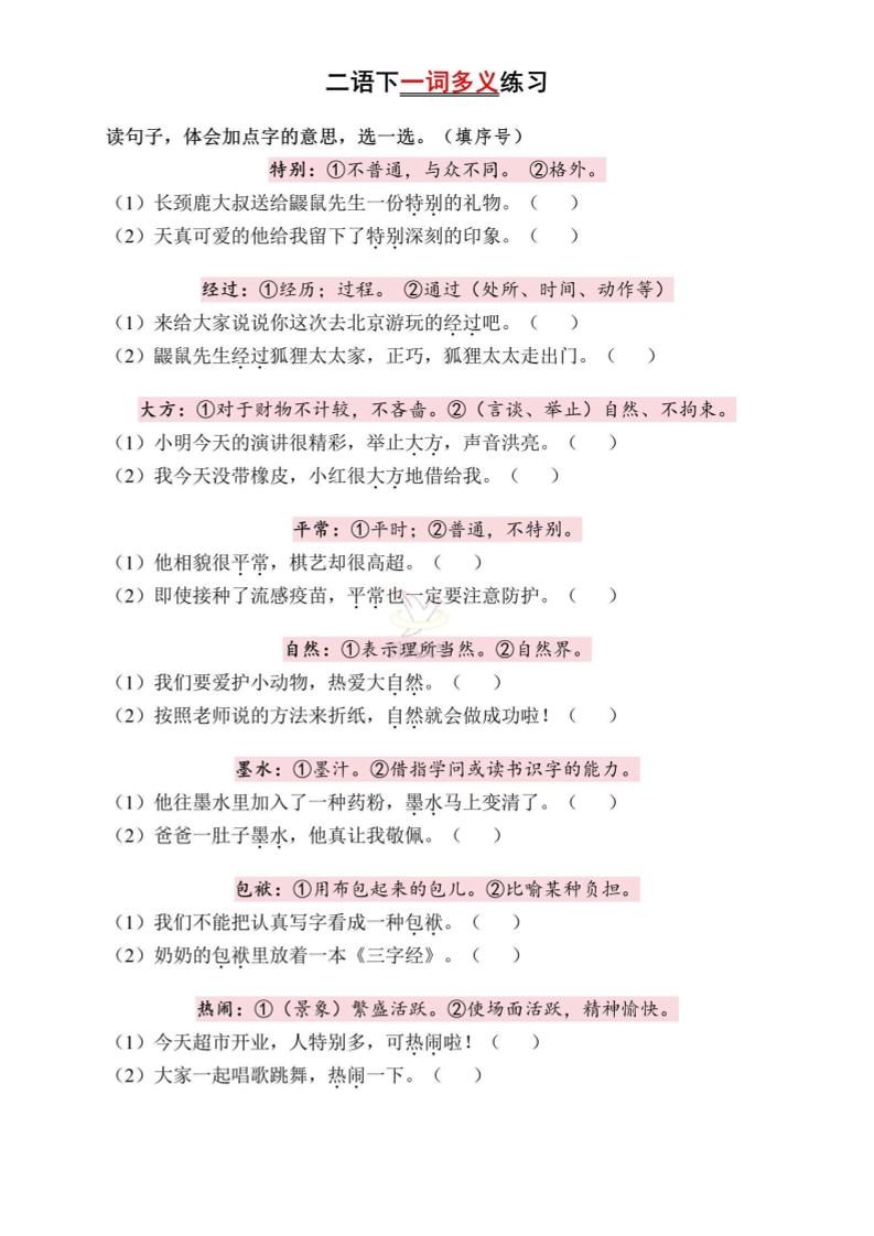 二下语文一词多义练习(含答案6页)