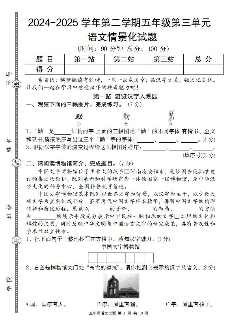当前位置:首页学科年级五年级2024-2025学年第二学期五年级语文第三单元情景化试题
