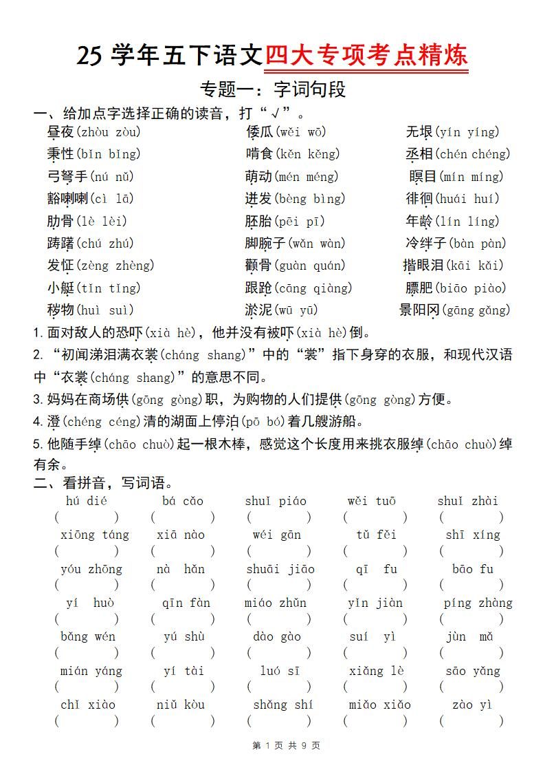 25学年五下语文四大专项考点精炼(专题一:字词句段)