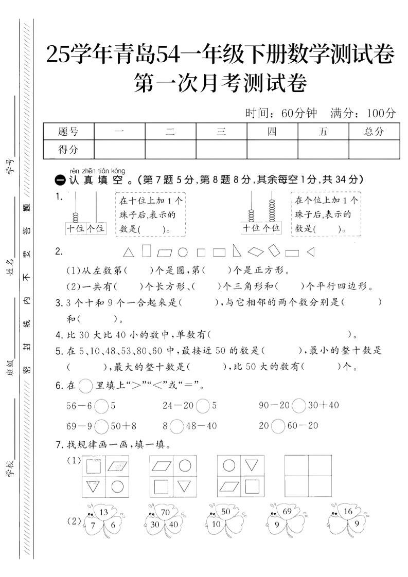 当前位置:首页学科年级一年级25学年青岛54一下数学第一次月考测试卷