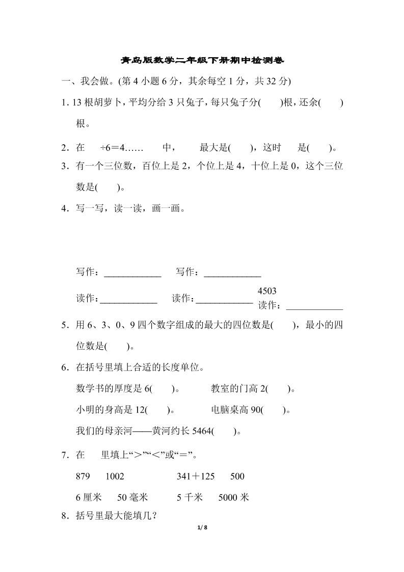 当前位置:首页学科年级二年级二下数学青岛63期中检测卷(含答案8页)