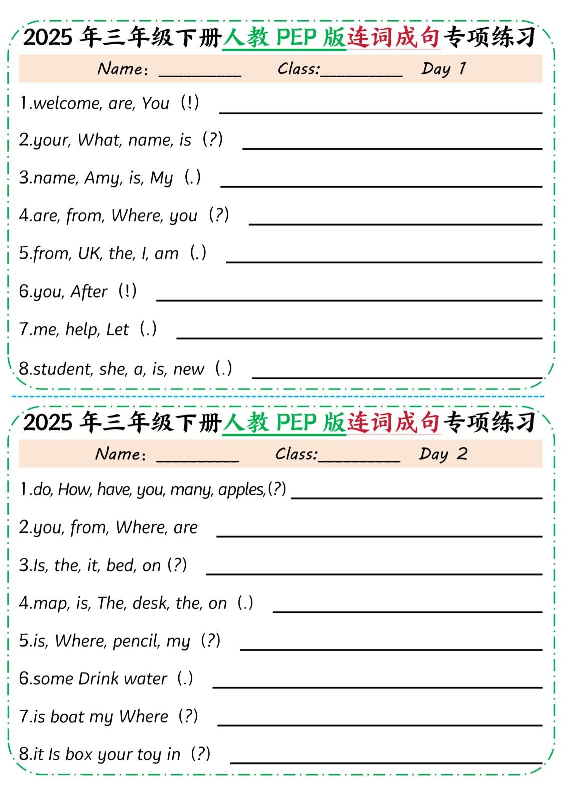 25年三下英语人教PEP版连词成句专项练习(含答案10页)
