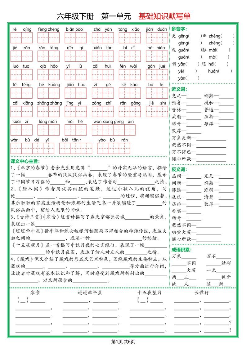 【基础默写单】六下语文