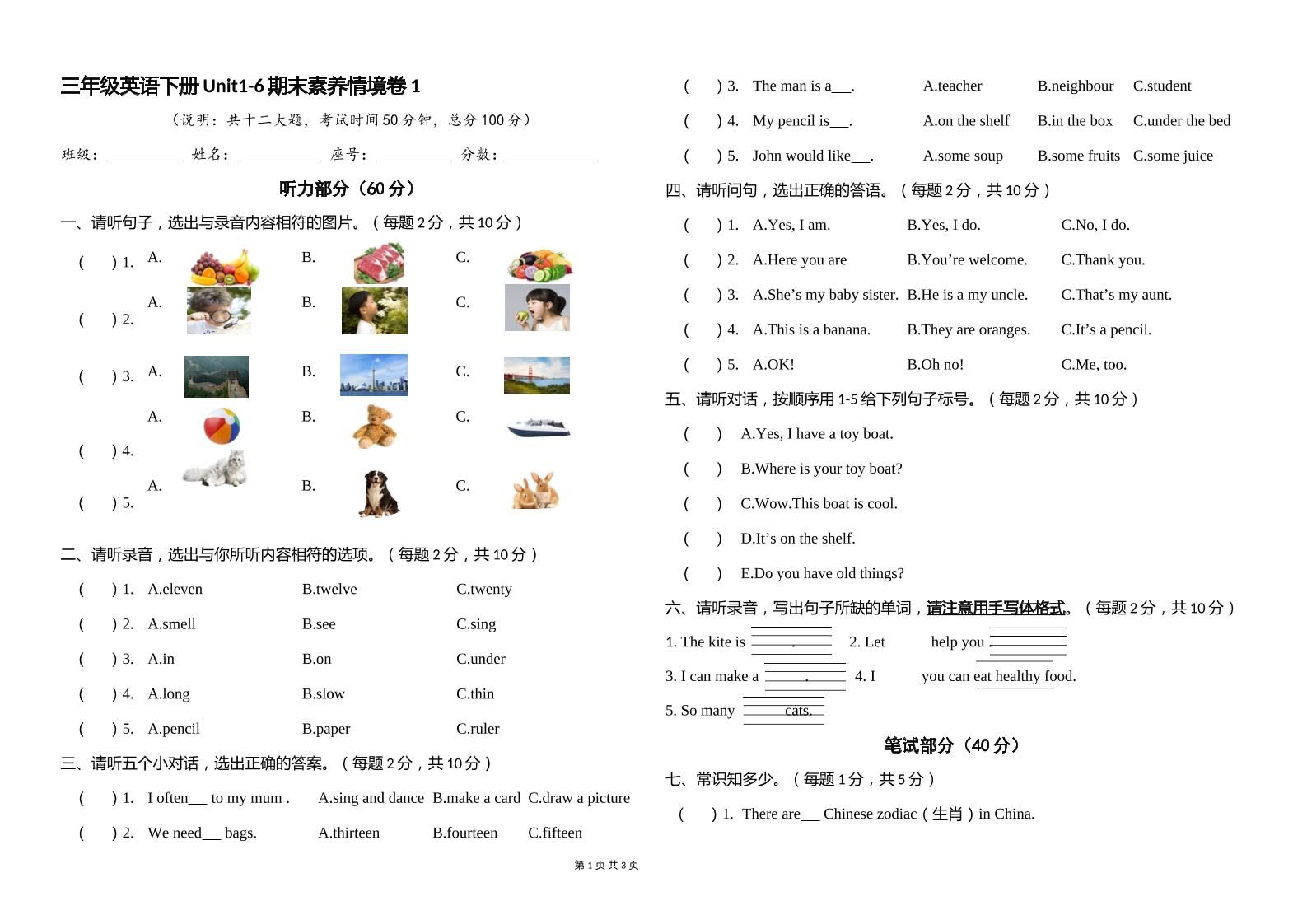 人教版(PEP)三年级英语下册Unit1-6期末素养情境卷1答题卡