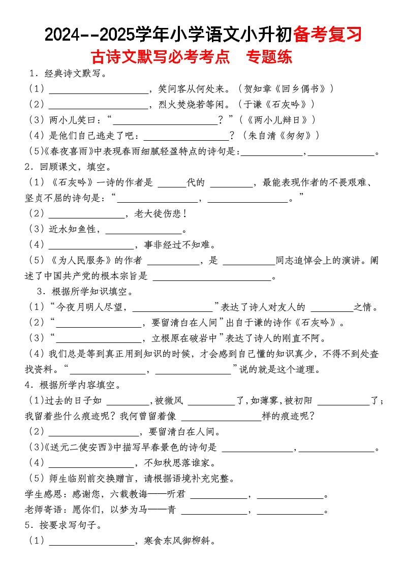当前位置:首页学科年级六年级小升初语文【备考复习古诗文默写必考考点】