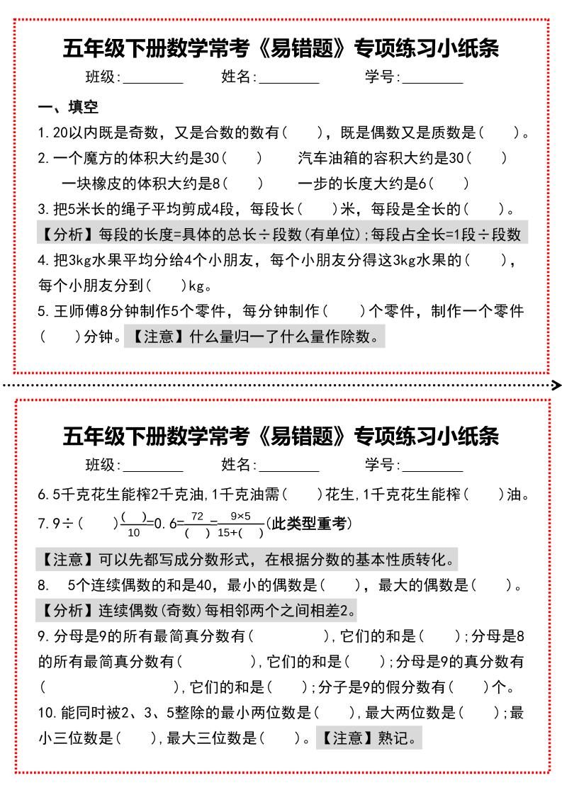 【期末复习每日系列】五年级下册数学常考《易错题》专项练习小纸条