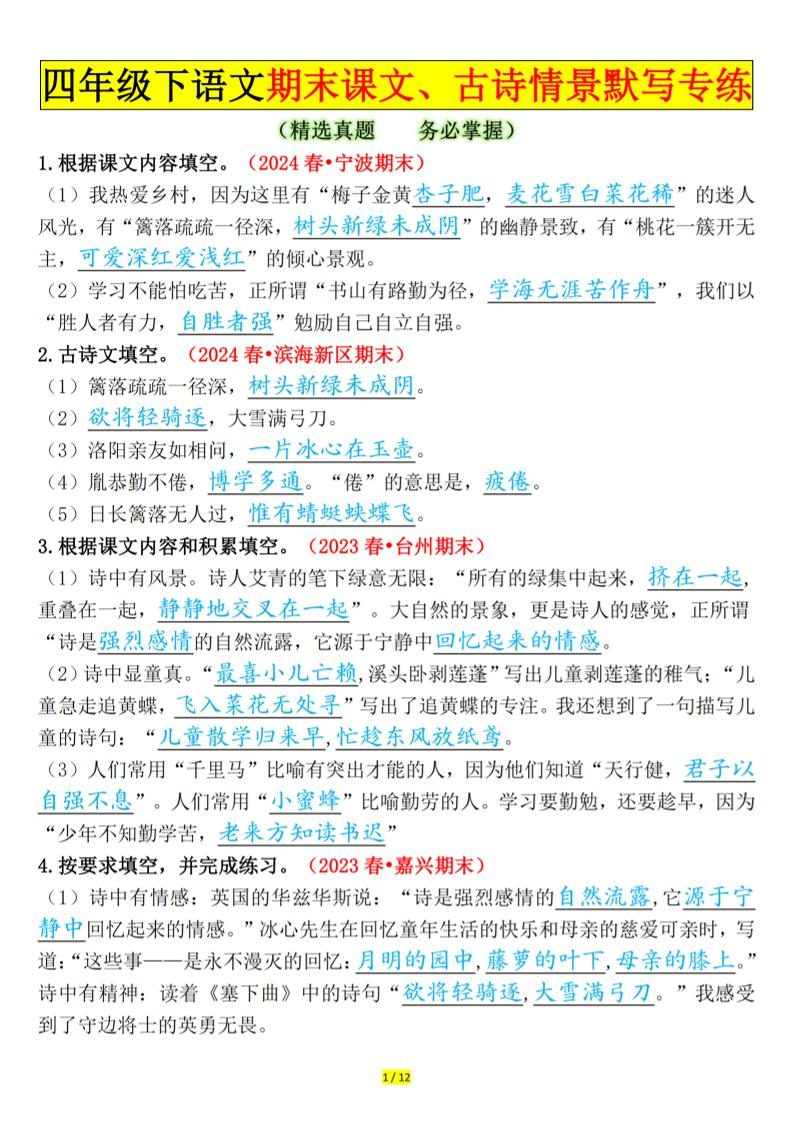 四下语文期末课文、古诗情景默写专练答案