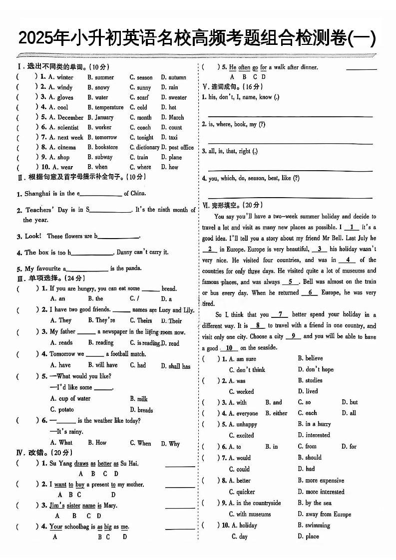 当前位置:首页学科年级六年级小升初英语【名校高频考题组合检测卷1-10】
