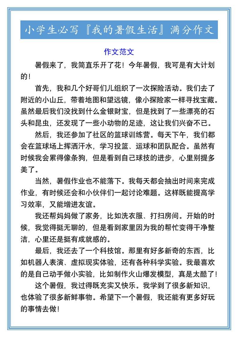 小学生必写『充实快乐的暑假』优秀范文-小升初语文