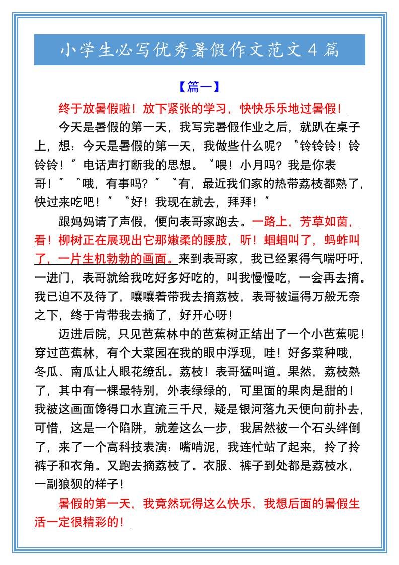 小学生必写优秀暑假作文范文4篇-小升初语文
