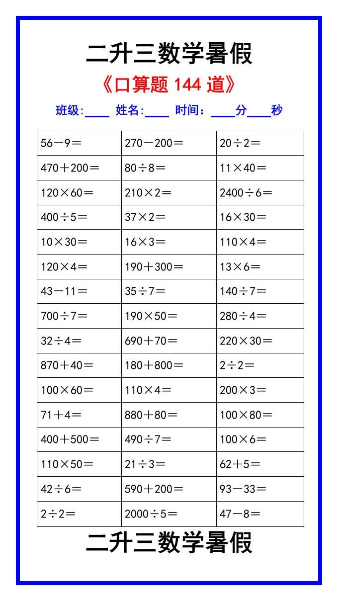 二升三数学暑假《口算练习题144道》汇总-三上数学
