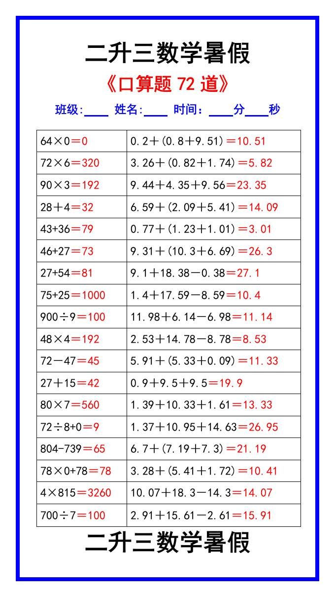 二升三数学暑假《口算练习题72道》汇总-三上数学