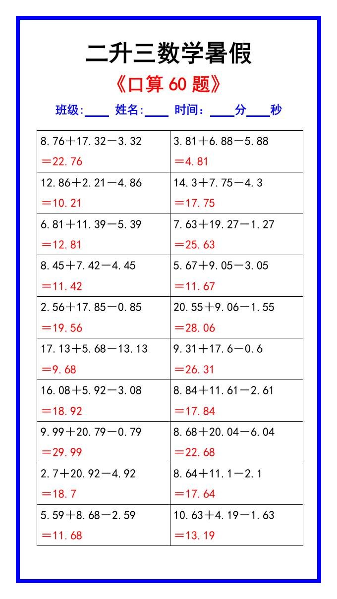 二升三数学暑假《口算练习60题》汇总-三上数学