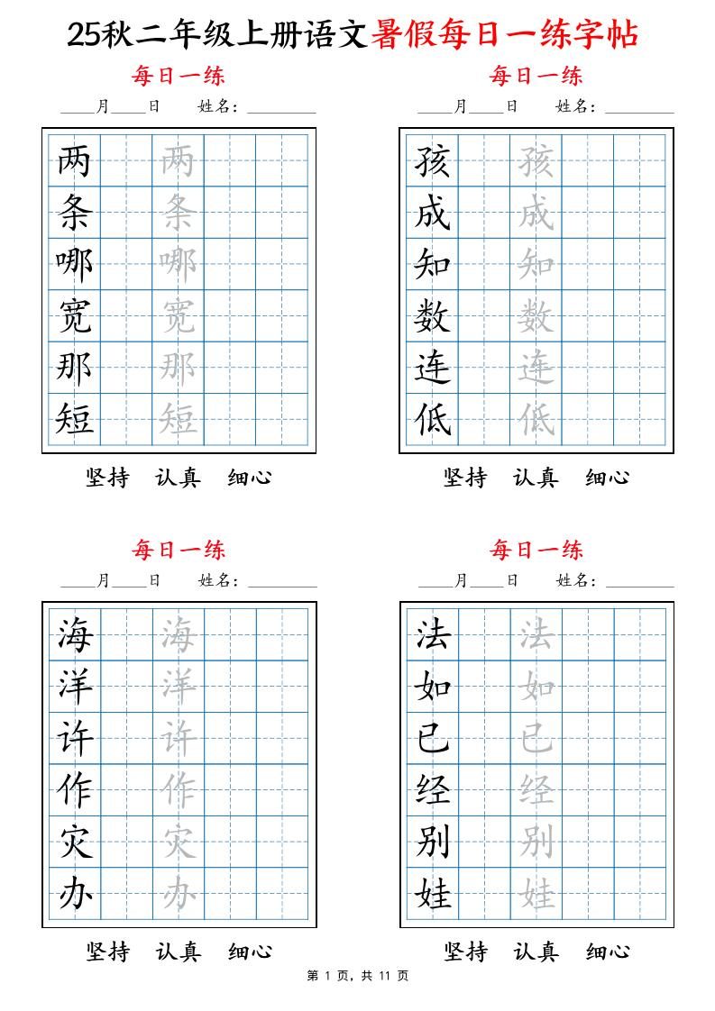 当前位置:首页学科年级二年级25秋二上语文暑假每日一练字帖6字版11页