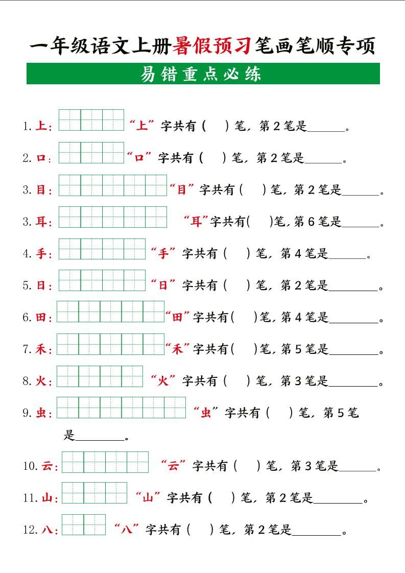 一上语文【暑假预习笔画笔顺专项】