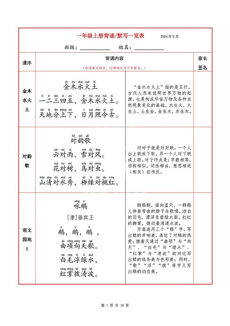 一上语文必背内容+默写表