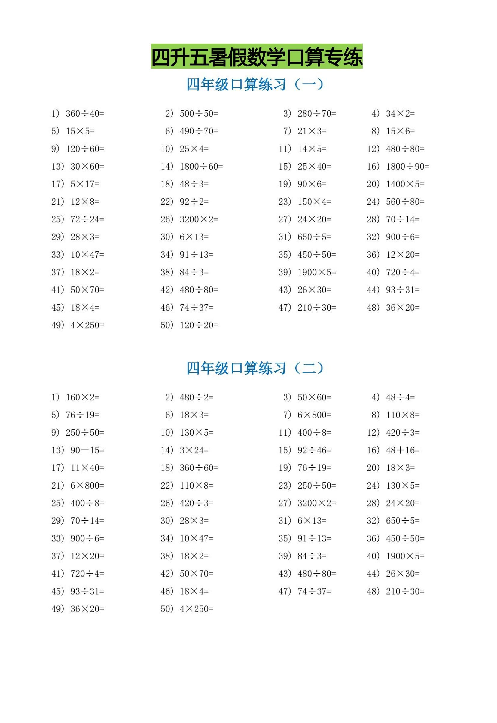 当前位置:首页学科年级五年级四升五暑假数学口算专练-五上数学