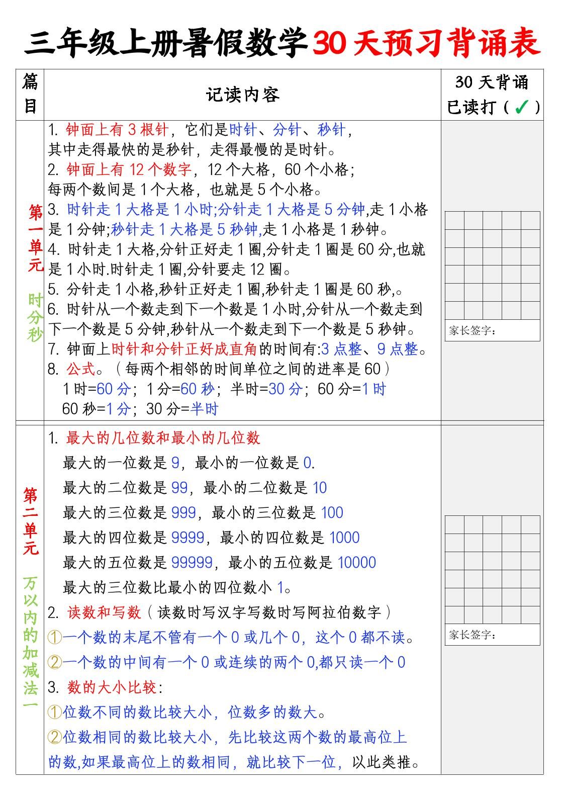 三上暑假数学30天预习背诵表