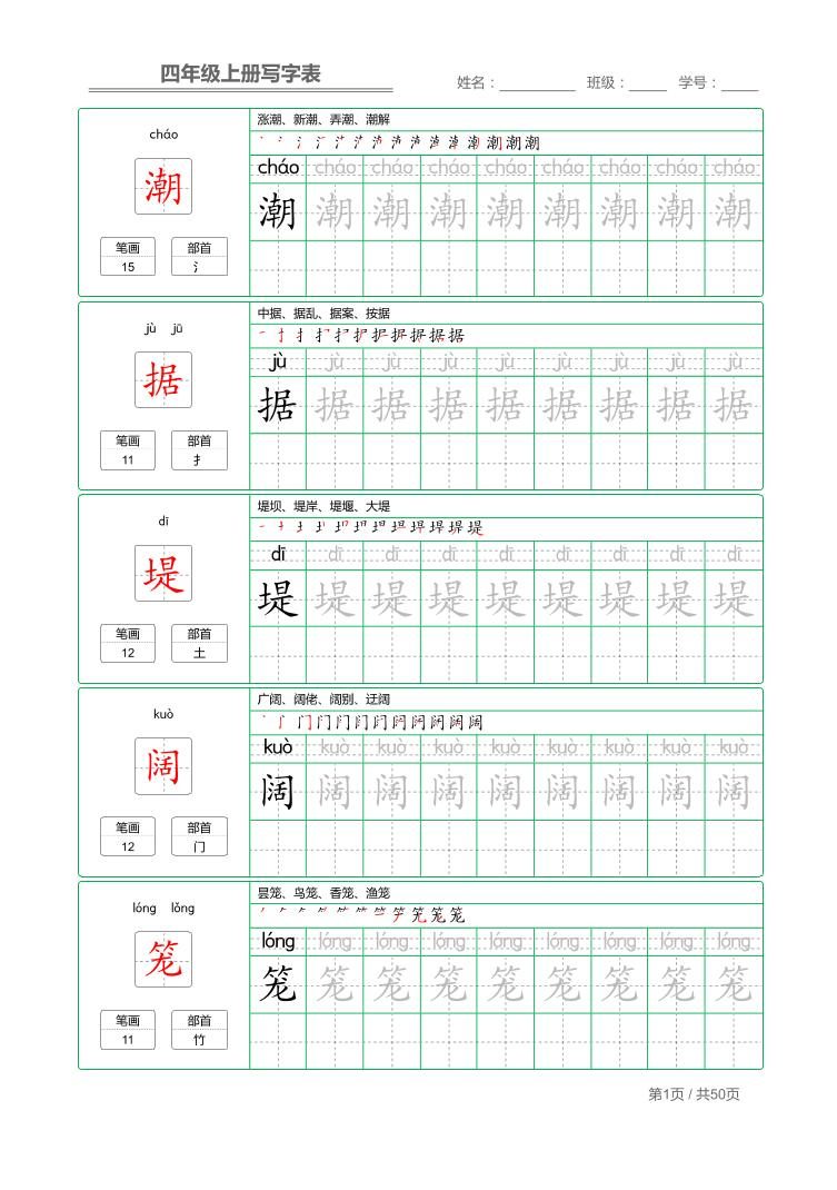 四年级上语文写字表字帖描红