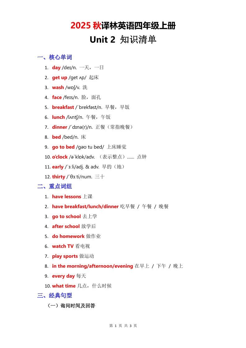 当前位置:首页学科年级四年级2025秋译林英语四上Unit2知识清单